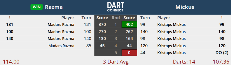 Perfect nine-dart leg with 180, 180 and checkout from 141 in the Latvian and Baltic ranking tournament – Priekule Cup 2014. (6/9/2014)